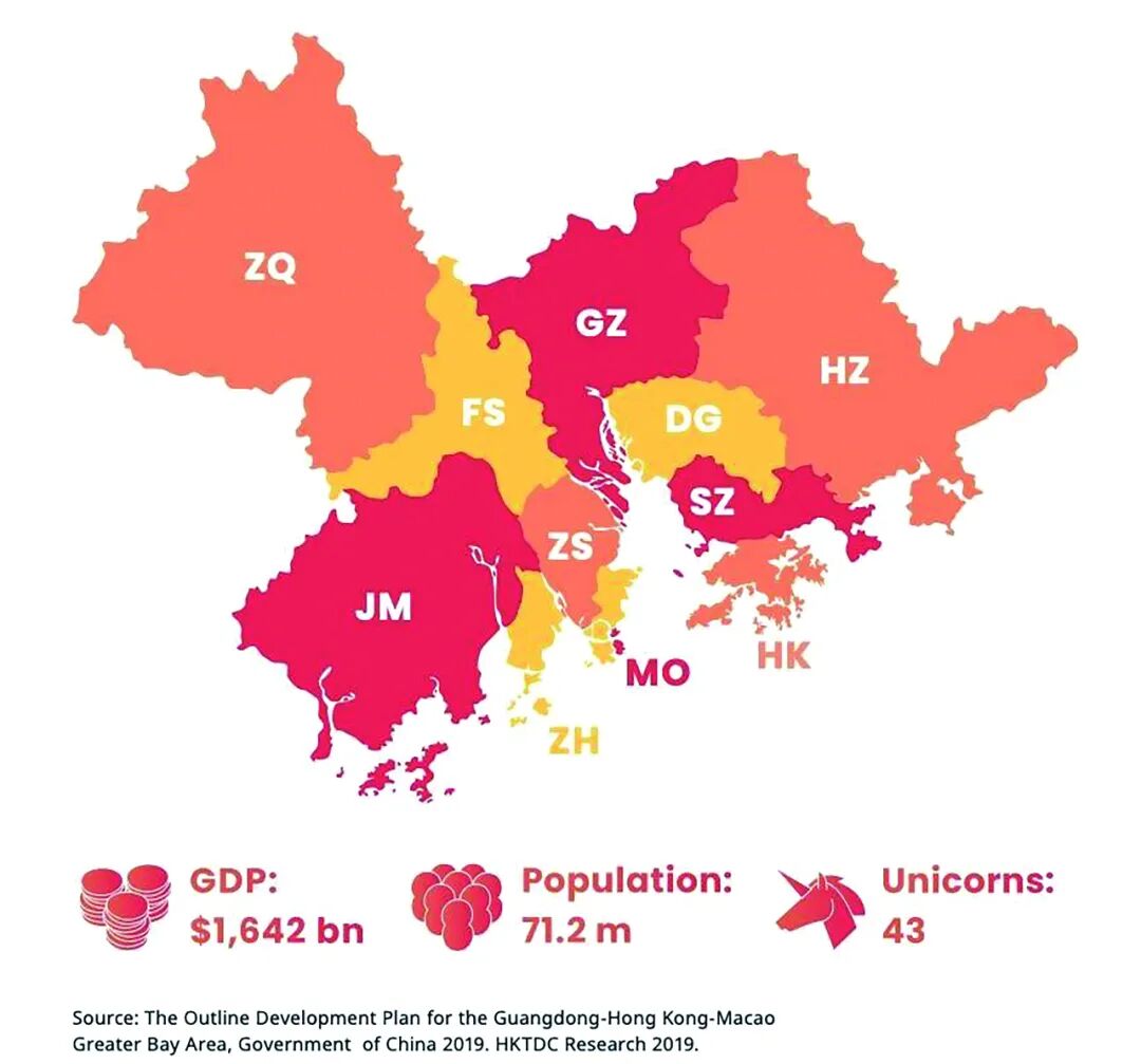 5.6万平方公里、7100万人口、9个城市和2个特别行政区,以不足全国5%的人口创造出了13%的经济总量。大湾区中的五座城市都登上了LEED中国排名的前二十,总共占据了全国25%的LEED认证的绿色建筑的体量。2019年2月18日,中共中央、国务院印发《粤港澳大湾区发展规划纲要》。按照规划纲要,粤港澳大湾区不仅要建成充满活力的世界级城市群、国际科技创新中心、“一带一路”建设的重要支撑、内地与港澳深度合作示范区,还要打造成宜居宜业宜游的优质生活圈,并支持重大合作平台建设、成为高质量发展的典范。其中共建宜居生活圈的概念,是以改善民生为重点,推进区域旅游完善生态建设和环境保护合作机制,建设绿色低碳湾区;重大合作平台的推进,包括了深圳前海、广州南沙、珠海横琴等重大粤港澳合作平台开发建设,充分发挥其在进一步深化改革、扩大开放、促进合作中的试验示范和引领带动作用,并复制推广成功经验。图源:HKTDC